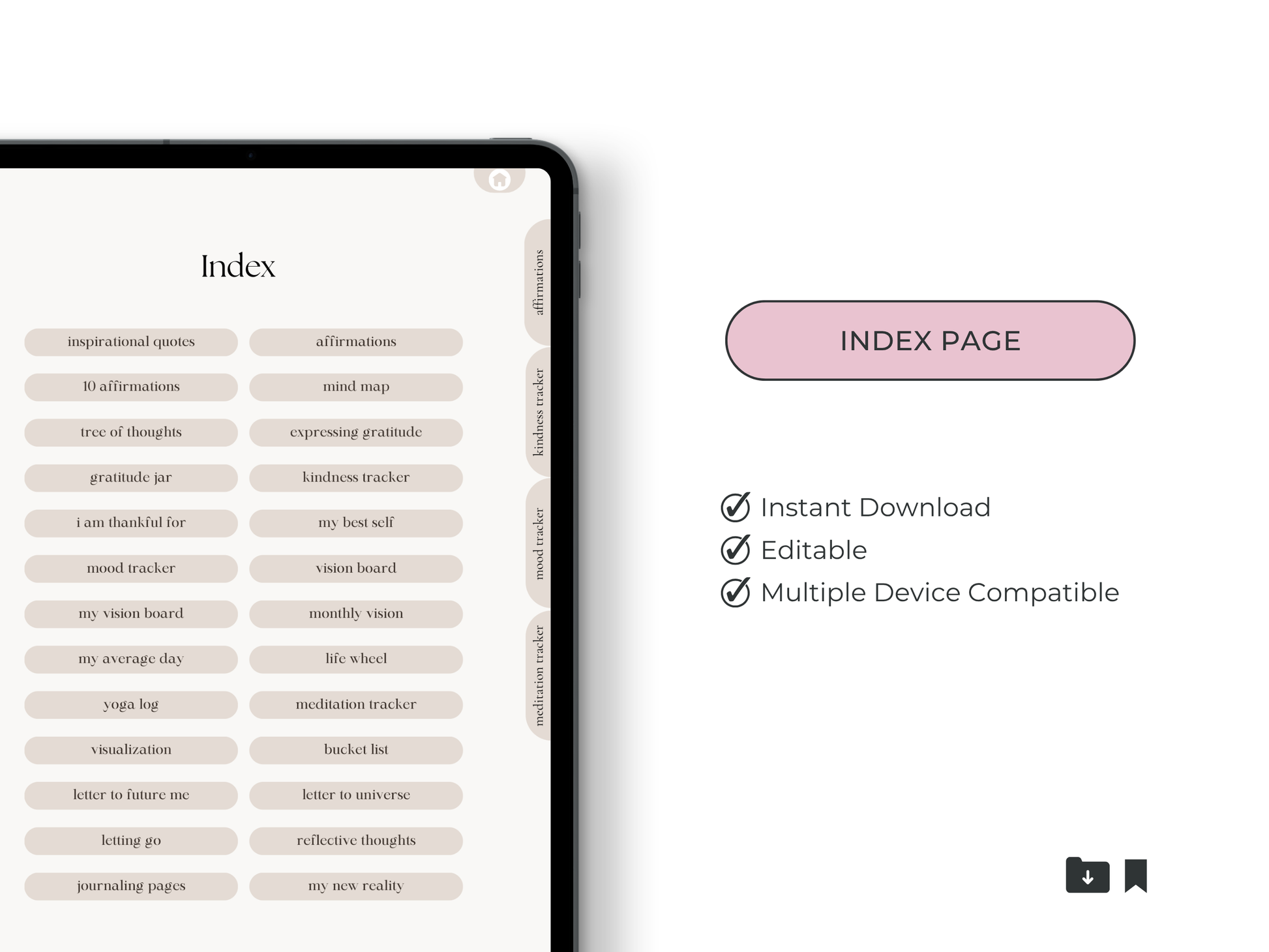 Unlock your potential and bring your dreams to life with our revolutionary Vision Board Digital Journal! Our meticulously designed 33-page planner is a powerhouse of tools and resources aimed at fueling your journey towards turning aspirations into reality. Packed with features like Inspirational Quotes, Affirmations, Mind Maps, Tree of Thoughts, Expressing Gratitude, Gratitude Jar, Kindness Tracker, and many more, every page is thoughtfully curated to spark motivation, foster optimistic outlooks, and lead you towards triumph. Embrace the power of visualization, positive affirmations, and structured goal-setting as you embark on a fulfilling path to success. Embrace our Vision Board Digital Journal and watch as your dreams unfold before your eyes.